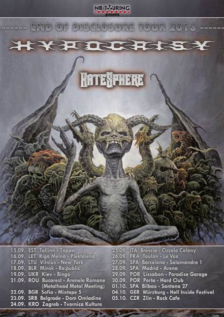Pochi ma buoni dunque, pazzi e in delirio di fronte all’ingresso di Peter e Mikael sulle note di End of Disclosure (opener solo per supporto al nuovo disco, l’opener ideale e definitiva resta Fractured Millenium), poi è il caos a regnare sovrano su Tales of Thy Spineless, in certi momenti irriconoscibile ma pur sempre devastante. Ormai la miccia è accesa Fractured Millenium ricorda a tutti perché siamo qui ad ommaggiare questa band e Left To Rot mi commuove come non avrei mai pensato, questo è Death Metal cazzo! (un bel concertino di soli pezzi dei primi due dischi è pura utopia ma sarebbe davvero gradito). The Eye riesce bene in sede live (ultima traccia tratta dal nuovo disco vista l’esclusione di 44 Double Zero) poi è The Abyss a rallentare le cose. Su Necronomicon Peter fa qualche somma anagrafica, poi è una Fire in the Sky un po confusa ad esaltare la platea. Valley of the Damned fa sgolare più di una persona mentre Buried -come mi aspettavo- mi fa uscire letteralmente fuori di testa (murdered, buried, forgotten…another life destroyed !!) con la sua ripartenza. Elastic Inverted Vision è la solita perfetta e lenta promessa di rivedersi all’inferno, canzone che non può mancare nella loro setlist (più canzoni dal disco omonimo porca zozza!) poi è Warpath mandare ulteriormente in delirio tutti con il suo epico refrain. Il bis -privato dalla seminale e monolitica Final Chapter– (che sia dannata la scarsa affluenza se è la causa per la quale me la sono persa) è aperto dalla storica Roswell 47 (ogni commento è superfluo, la loro canzone più conosciuta in assoluto) seguita a ruota dalla “three songs in one” Adjusting The Sun, beh, sentirla live è pari ad un orgasmo, meglio non dire altro nel caso ci fossero minorenni in lettura. Chiusura definitiva affidata all’acclamata Eraser, avrei fatto altre scelte a riguardo ma gli Hypocrisy sono gli Hypocrisy e possono fare quello che vogliono con la loro sconfinata scelta di tracks.
